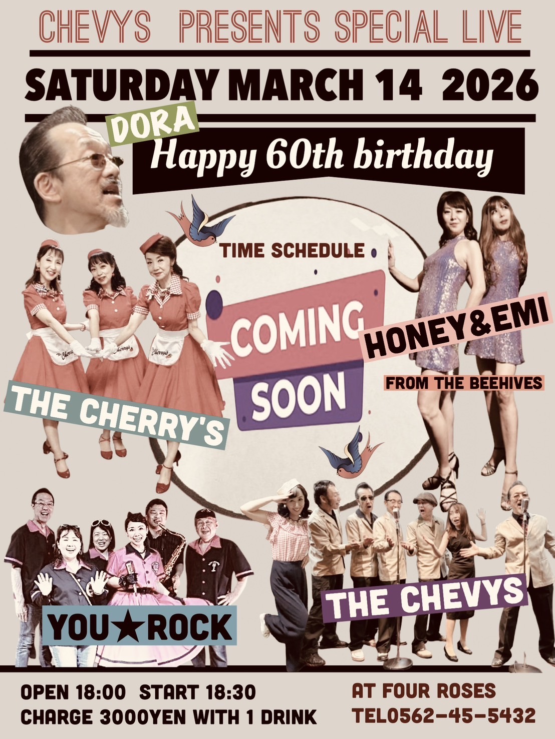 « すべてのイベント 【3/14(土)】CHEVYS PRESENTS SPECIAL LIVE 2026年3月14日 @ 6:00 PM - 10:00 PM ¥3,000 « 【2/22(日)】OLDIES NIGHT Tweet Check + Google カレンダー+ iCal エクスポート 詳細 日付: 2026年3月14日 時間: 6:00 PM - 10:00 PM 参加費: ¥3,000 イベントカテゴリー: OLDIES NIGHT